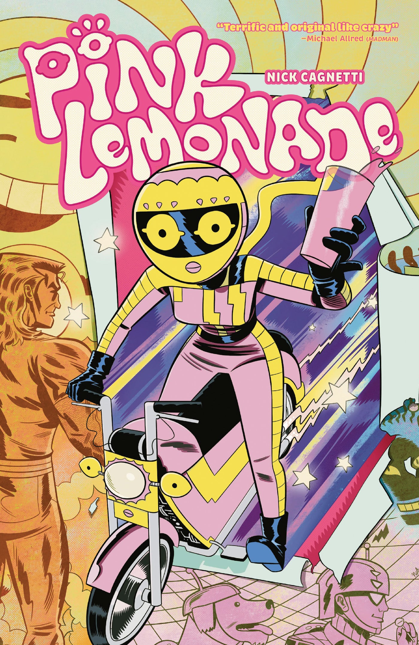 Mysterious past! Colorful costume! Altruistic outlook! Zippy motorcycle! And one very overactive imagination! Meet PINK LEMONADE—the new hero on the scene! She dreams of doing big things, but ultimately, she'll settle for just helping where she can. But when Pink Lemonade accidentally crashes into the set of the next Rex Radical blockbuster, she'll take an unexpected leap into the spotlight...and will soon find herself confronted by a series of increasingly threatening doppelgängers, extraterrestrial fanboys, and nefarious corporate machinations.