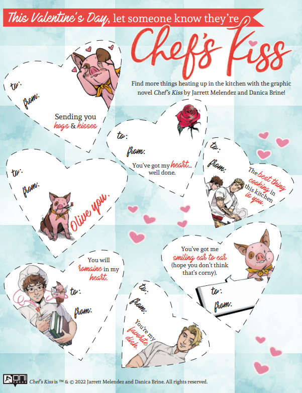 Let your Valentine know they're hotter than a three-alarm chili with these adorable and free printable greetings! Featuring the art and characters of Jarrett Melendez and Danica Brine's Chef's Kiss, these heart-shaped messages are sure to bring your sweetie's heart up to temperature.
