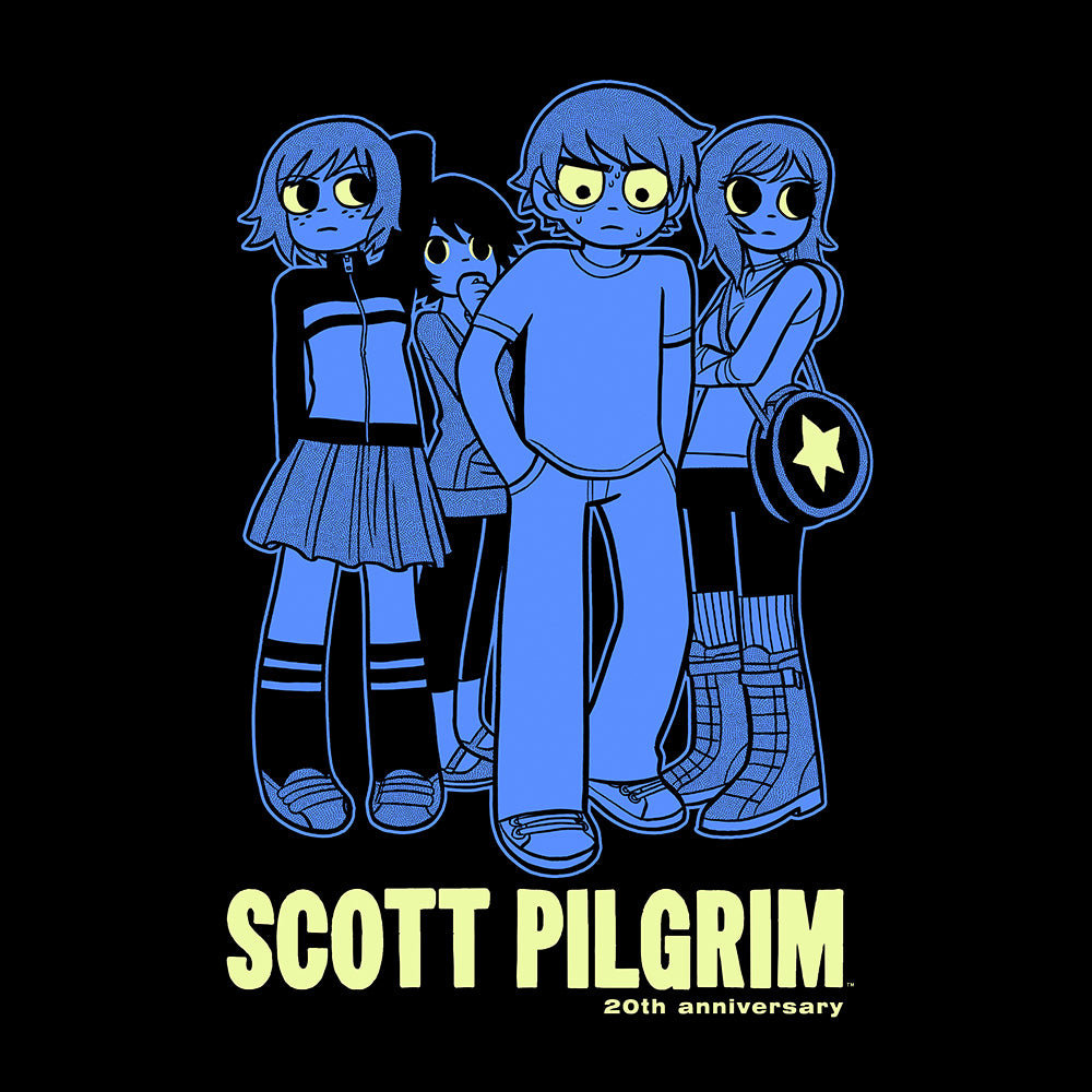 Recreating a shirt that was briefly available in the 2000s. The shirt depicts Scott Pilgrim looking stressed-out in front of a group of women, for some reason.