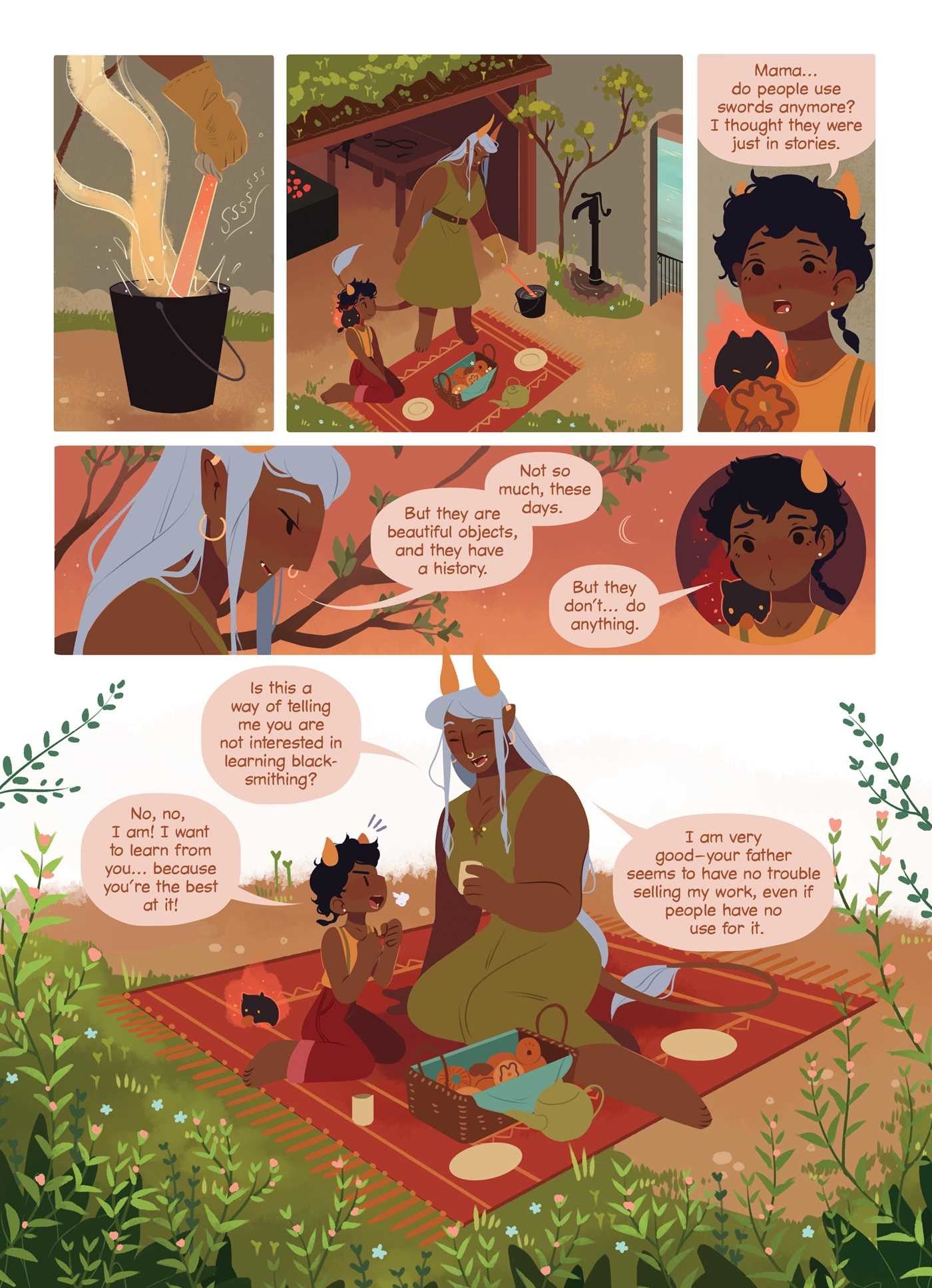 From K. O'Neill, the award-winning author of Princess Princess Ever After comes THE TEA DRAGON SOCIETY, the beloved and charming all-ages book that follows the story of Greta, a blacksmith apprentice, and the people she meets as she becomes entwined in the enchanting world of tea dragons. After discovering a lost tea dragon in the marketplace, Greta learns about the dying art form of tea dragon care-taking from the kind tea shop owners, Hesekiel and Erik. As she befriends them and their shy ward, Minette, Greta sees how the craft enriches their lives—and eventually her own.